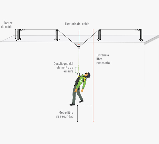 Además de la mencionada carga, en el momento de la caída el cable generará una flecha. Esta flecha se verá condicionada por el número de usuarios anclados a la línea de vida y por el factor de caída en el que se haya instalado la línea.